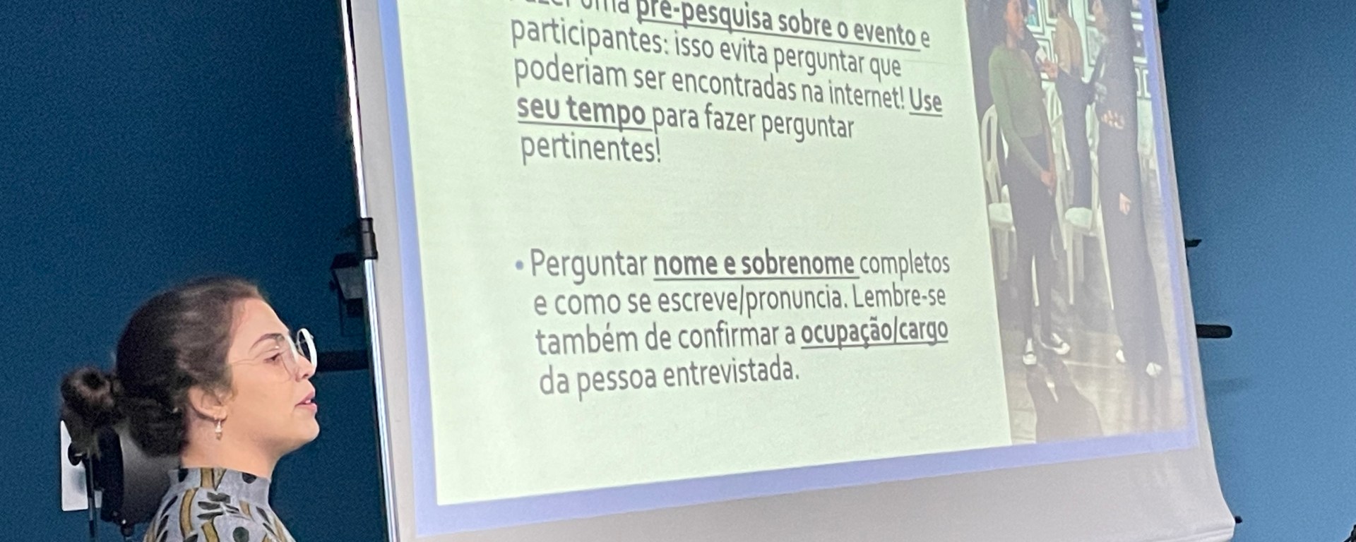 Clarice Muscalu, por sua vez, pontuou momentos do trabalho feito nas mídias sociais do evento da instituição, elencando ainda algumas características, tal como a publicação de conteúdo em tempo real. Por fim, Sarah Resende articulou questões para se pensar durante a produção textual de matérias jornalísticas de eventos.