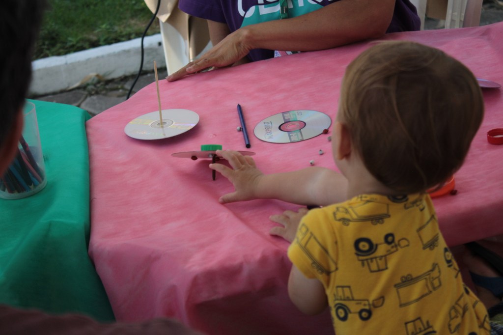 O educador ainda trouxe as oficinas “Engenhoca com Bolinhas”, na qual o público criava circuitos para bolinhas de gude e roll-on passarem, e a “Pega-Rato” – uma brincadeira coletiva com materiais recicláveis.