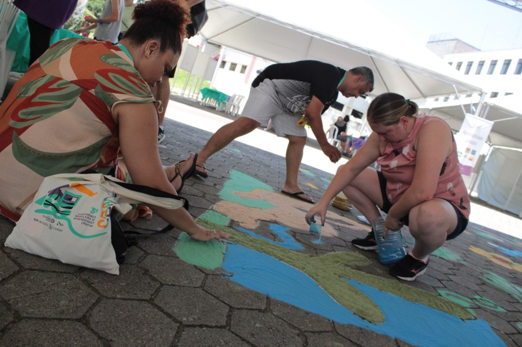 Outro espaço que obteve grande interesse por parte do público na quarta-feira foi a oficina de confecção de tapetes com areia e serragem coloridas.