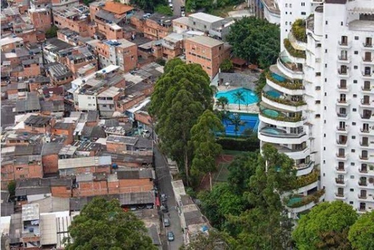 No Brasil, a desigualdade social é exposta nas ruas das grandes cidades. Uma foto captura o contraste brutal: de um lado, um arranha-céu brilhante reflete o sol da manhã, símbolo de poder e prosperidade. As favelas, por outro lado, aglomeram-se à sombra desses gigantes de concreto, com casas empilhadas umas sobre as outras como uma peça irregular de um quebra-cabeça.