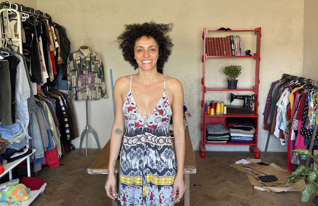 É o caso da costureira Vanessa Alves Lopes que, desde a pandemia, vê em seu brechó um espaço de transformação. É na parte debaixo da casa onde mora que as ideias que imagina ganham vida, e seu ateliê se transforma num pequeno negócio. “Sempre que às vezes eu tenho alguém que vem no brechó para comprar uma roupa, traz um conserto. Sempre que alguém traz um conserto, ou vai fazer uma peça, compra uma roupa de brechó”.
