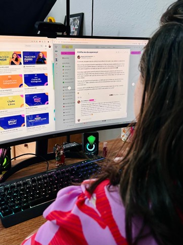 A escolha pela carreira, no entanto, não foi planejada. “Eu nunca pensei em ser professora. Foi algo que aconteceu por acaso, mas eu sempre gostei muito de inglês”, relembra Elysa. Durante a graduação, ela percebeu que o ambiente da sala de aula tradicional não atendia às suas expectativas. A experiência não a agradava e ela sentia a falta de valorização da profissão no mercado. Mesmo assim, já dava algumas aulas particulares e começou a enxergar nessa prática uma oportunidade de trilhar um caminho diferente, mais alinhado às suas aspirações.