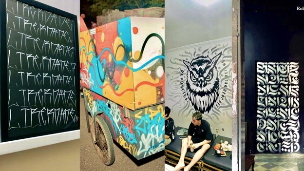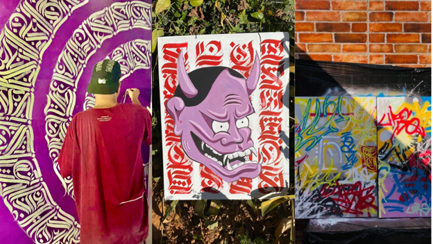 Essa dualidade se reflete também em sua técnica, o Caligraffiti, uma fusão de caligrafia e grafismo que explora formas abstratas e fluidez. “Essa técnica mistura caos e controle, algo que vem muito da pichação e do grafite paulistano, mas que hoje tem ganhado espaço no Brasil e no mundo”, comenta.