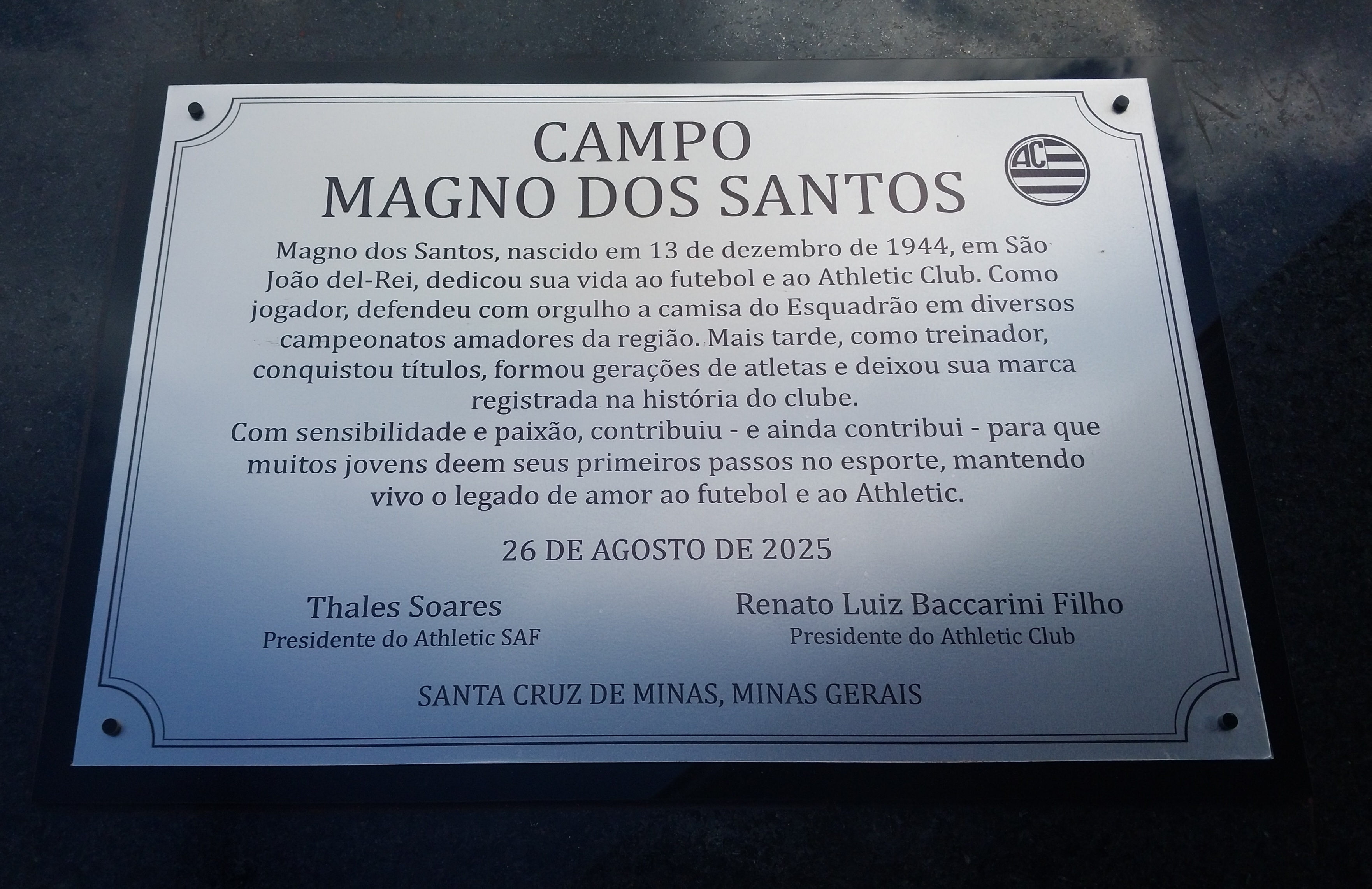 Nessa semana, o Athletic Club deu um importante passo em sua estruturação profissional com a inauguração do primeiro campo do recém-criado Centro de Treinamento Magno dos Santos, em Santa Cruz de Minas (MG). A cerimônia contou com um coquetel, a presença de autoridades municipais, patrocinadores, atletas, dirigentes do clube – e teve cobertura especial do portal Notícias del-Rei, que acompanhou o evento.